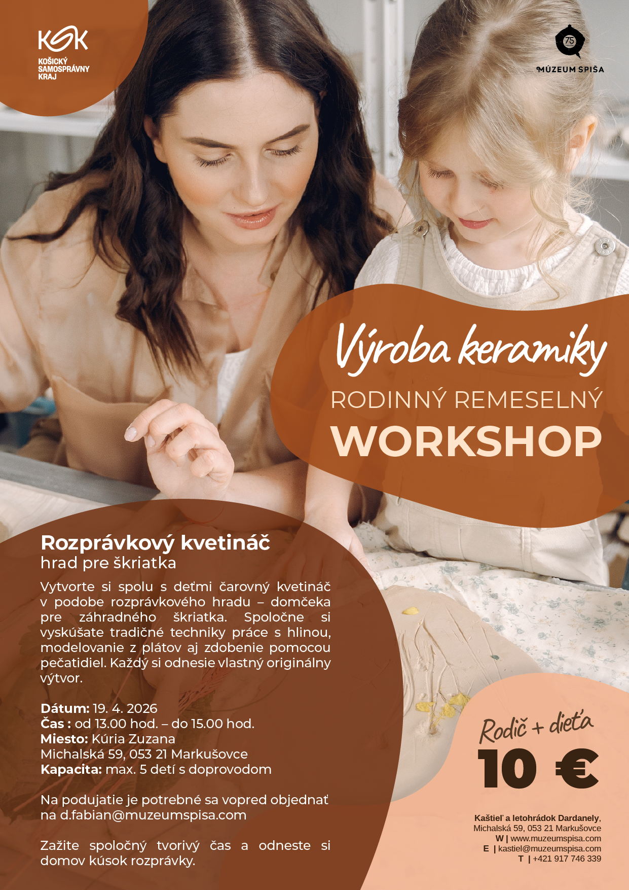 Vytvorte si spolu s deťmi čarovný kvetináč v podobe rozprávkového hradu – domčeka pre záhradného škriatka. Spoločne si vyskúšate tradičné techniky práce s hlinou, modelovanie z plátov aj zdobenie pomocou pečatidiel. Každý si odnesie vlastný originálny výtvor.