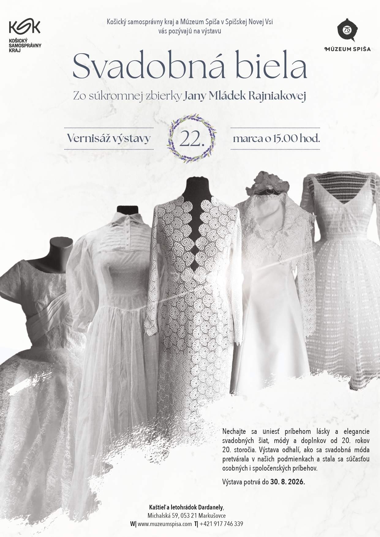 Nechajte sa uniesť príbehom lásky a elegancie svadobných šiat, módy a doplnkov od 20. rokov 20. storočia. Výstava odhalí, ako sa svadobná móda pretvárala v našich podmienkach a stala sa súčasťou osobných i spoločenských príbehov.