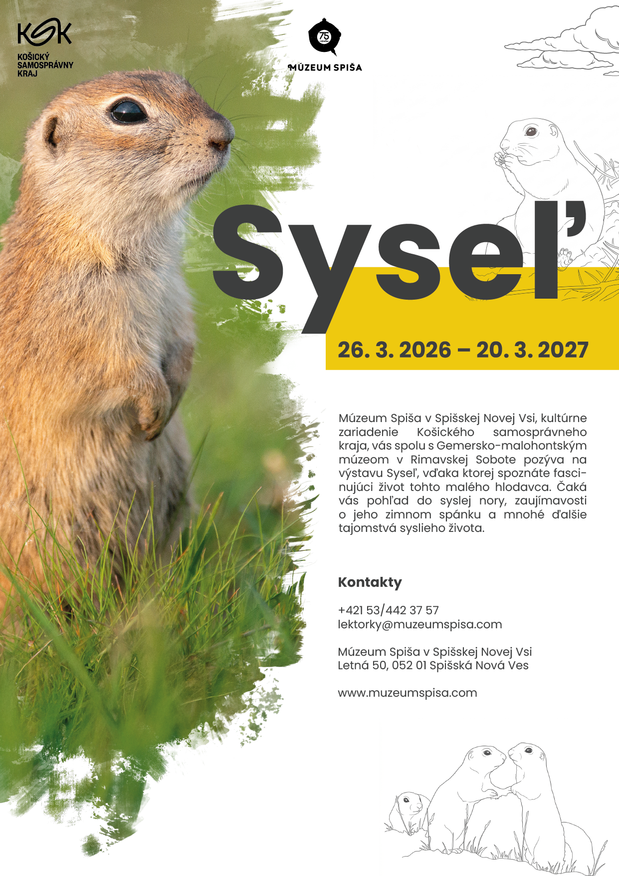 Múzeum Spiša v Spišskej Novej Vsi, kultúrne zariadenie Košického samosprávneho kraja, vás spolu s Gemersko-malohontským múzeom v Rimavskej Sobote pozýva na výstavu Syseľ, vďaka ktorej spoznáte fascinujúci život tohto malého hlodavca. Čaká vás pohľad do syslej nory, zaujímavosti o jeho zimnom spánku a mnohé ďalšie tajomstvá syslieho života.